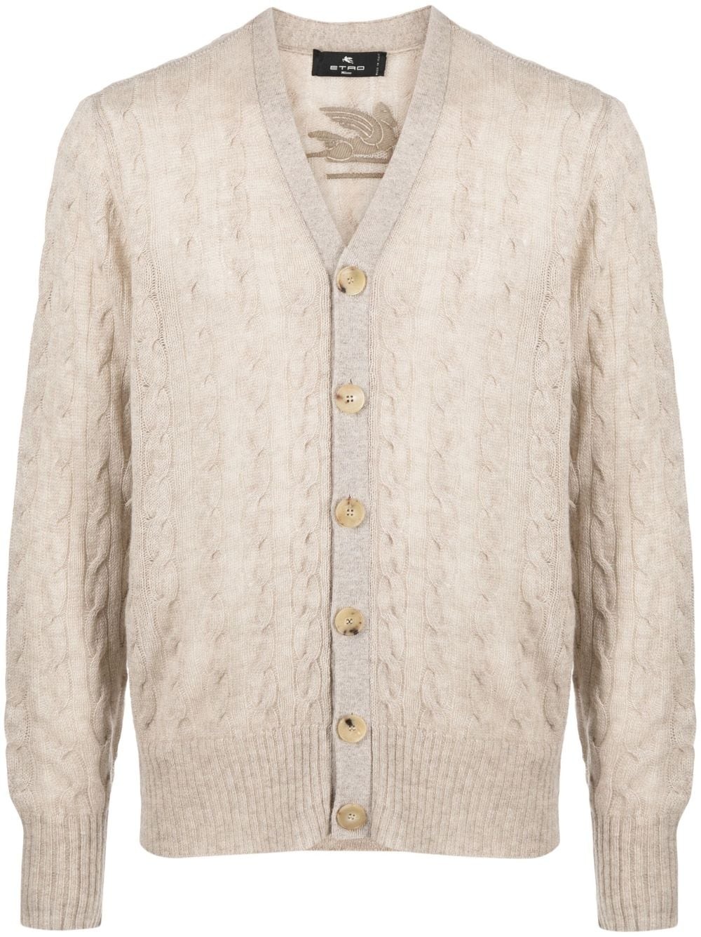 cable-knit cashmere cardigan Highlights - Beige - Cashmere - Cable knit - V-neck - Front button fastening - Long sleeves - Ribbed cuffs and hem - Straight hem Made in Italy Composition Cashmere 100% SIZE & FIT Model measurements Height 6 ft 2 in(1.87 m) Bust/Chest 38.18 in(97 cm) Hips 36.61 in(93 cm) Waist 29.13 in(74 cm) FittingInformation Designed for a relaxed fit, this piece allows for comfort and movement when worn Made with a midweight knit, this piece offers some stretch This piece fits true to size – take your usual size Washing instructions Dry Clean Only
