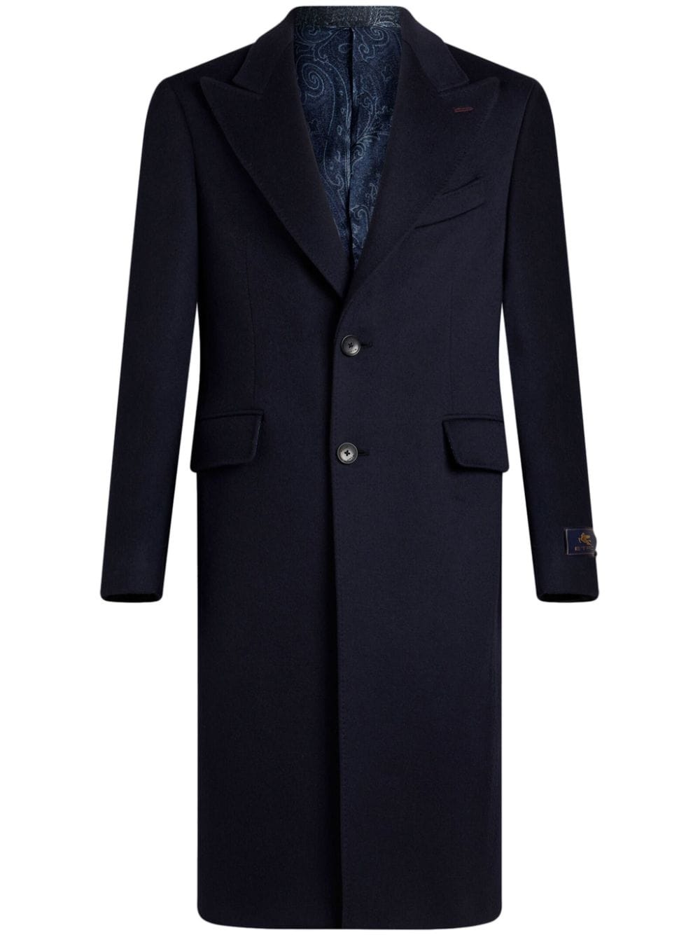 cashmere coat Highlights - Navy blue - Cashmere - Front button fastening - Peak lapels - Long sleeves - Buttoned cuffs - Logo patch at the sleeve - Chest welt pocket - Two front flap pockets - Central rear vent - Full lining - Straight hem - Knee-length Made in Italy Composition Outer: Cashmere 100% Lining: Viscose 100%