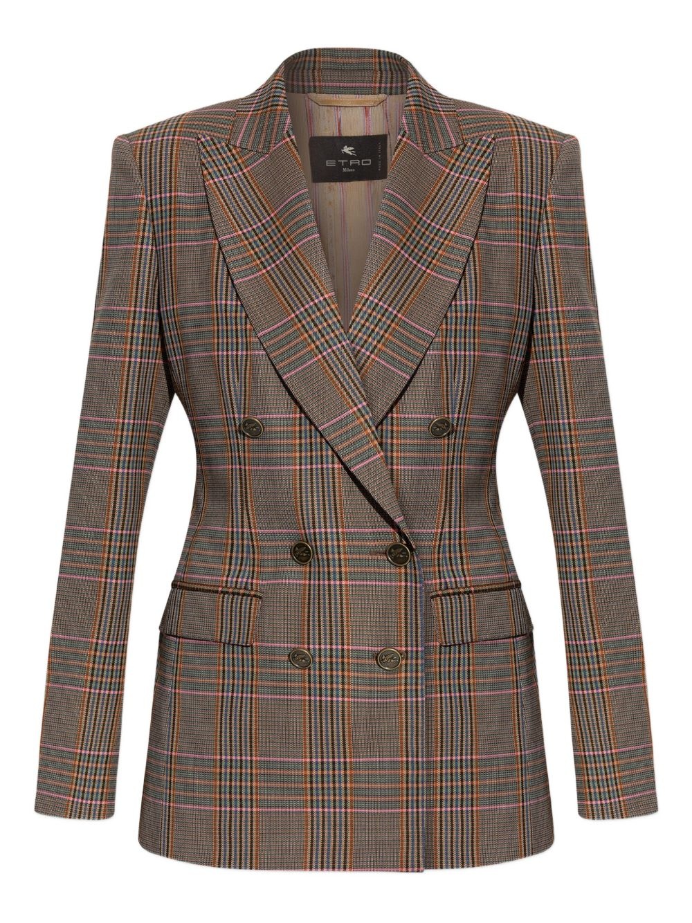 checked double-breasted blazer Highlights - Brown - Checked pattern - Double-breasted button fastening - Peak lapels - Tailored shoulders - Long sleeves Made In Italy Composition Outer: Polyester 53%, Wool 43%, Elastane 4% Lining: Viscose 52%, Acetate 48% Washing instructions Read Manufacturer Guidelines