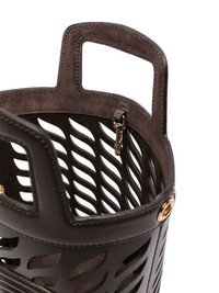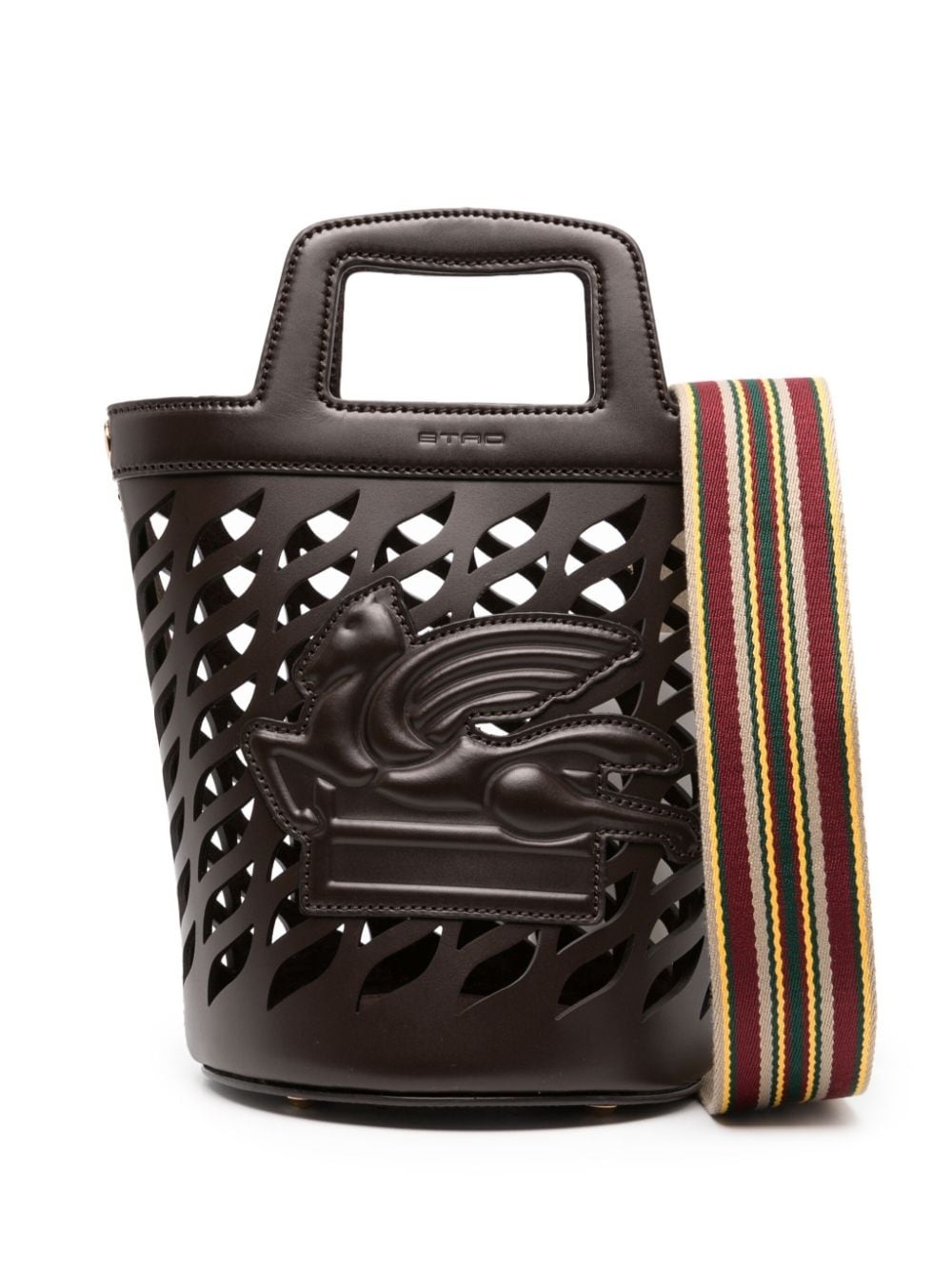 Coffa leather bucket bag ETRO presents this Coffa bucket bag, which ic crafted from laser-cut calf leather and adorned with the brand's signature Pegaso logo at the front. It can be hand-held by the cut-out top handles or styled across the body thanks to the striped detachable shoulder strap. Highlights - Brown - Calf leather - Bucket body - Signature pegaso motif - Laser-cut detail - Cut-out top handle - Hook-clip fastening - Detachable shoulder strap - Main compartment Made in Italy Composition Lining: Calf Leather 100% Outer: Bullhide Leather 100% SIZE & FIT Model measurements Height 5 ft 9 in(1.75 m) Bust/Chest 31.1 in(79 cm) Hips 33.46 in(85 cm) Waist 23.22 in(59 cm) Measurement DEPTH 6.69 in(17 cm) HANDLE 2.36 in(6 cm) HEIGHT 9.44 in(24 cm) STRAP 21.65 in(55 cm) WIDTH 6.69 in(17 cm)