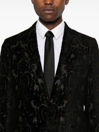 devore-effect single-breasted blazer Highlights - Black - Devore effect - Metallic threading - Peak lapels - Long sleeves with faux buttoned cuffs - Chest welt pocket - Dart detailing - Two front jetted pockets - Straight hem - English rear vents - Multiple internal slip pockets - Full logo-jacquard lining - Fabric-covered buttons - Front button fastening Made in Italy Composition Outer: Viscose 62%, Cotton 32%, Polyamide 6% Lining: Viscose 100% SIZE & FIT Model measurements Height 6 ft 2 in(1.88 m) Bust/Chest 36.61 in(93 cm) Hips 35.82 in(91 cm) Waist 27.95 in(71 cm) FittingInformation Designed for a slim fit, offering a comfortable fit that sits just away from the body The internal shoulder pads offer a structured shape Made from a midweight non-stretch fabric This piece fits true to size – take your usual size