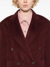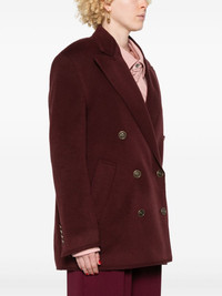 double-breasted coat Highlights - Bordeaux red - Wool-cashmere blend - Brushed finish - Double-breasted button fastening - Peak lapels - Shoulder pads - Long sleeves - Buttoned cuffs - Logo-embossed buttons - Full lining - Straight hem Made in Italy Composition Outer: Wool 90%, Cashmere 10% Lining: Viscose 52%, Acetate 48% SIZE & FIT Model measurements Height 5 ft 9 in(1.75 m) Bust/Chest 34.64 in(88 cm) Hips 36.61 in(93 cm) Waist 26.37 in(67 cm) FittingInformation Designed for an oversized fit, offering additional room throughout The internal shoulder pads offer a structured shape Made from a midweight non-stretch fabric