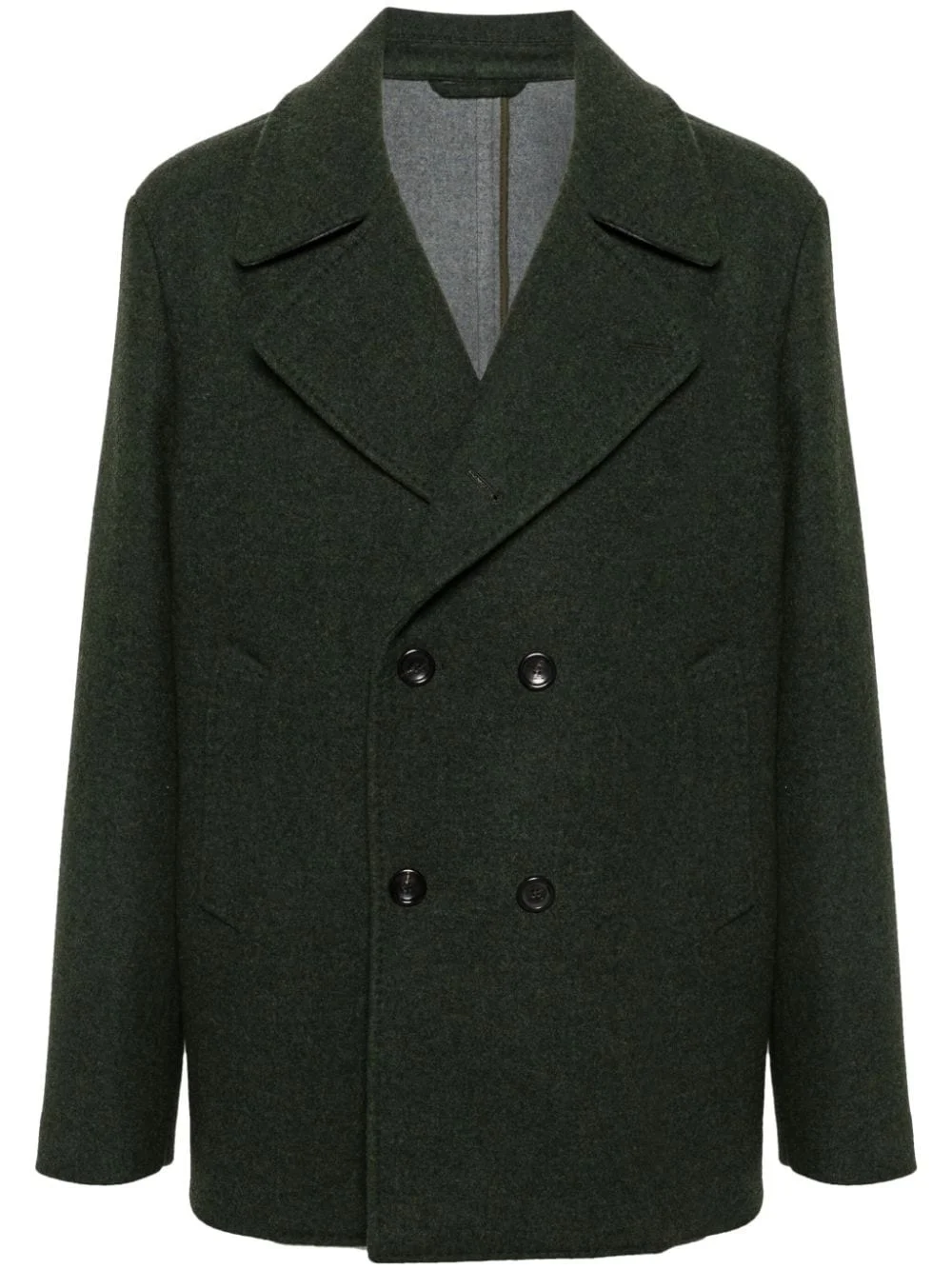 double-breasted peacoat Highlights - Forest green - Wool-cashmere blend - Felted finish - Wide notch lapels - Double-breasted button fastening - Long sleeves - Two side welt pockets - American rear vent - Straight hem - Partial lining Made in Italy Composition Outer: Wool 90%, Cashmere 10% Lining: Viscose 100% SIZE & FIT Model measurements Height 6 ft 2 in(1.88 m) Bust/Chest 36.61 in(93 cm) Hips 35.82 in(91 cm) Waist 27.95 in(71 cm) FittingInformation Designed to be unstructured, offering a loose fit throughout The vented hem offers movement at the rear Made from a midweight non-stretch fabric This piece fits true to size – take your usual size