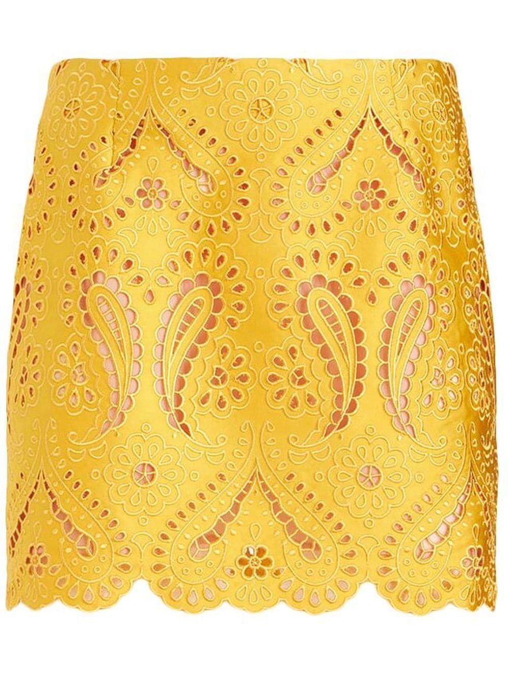 embroidered design mini skirt sunset yellow cotton/silk embroidered design mid-rise scallop hem above-knee length Made in Italy Composition Outer: Cotton 100% Lining: Silk 100%
