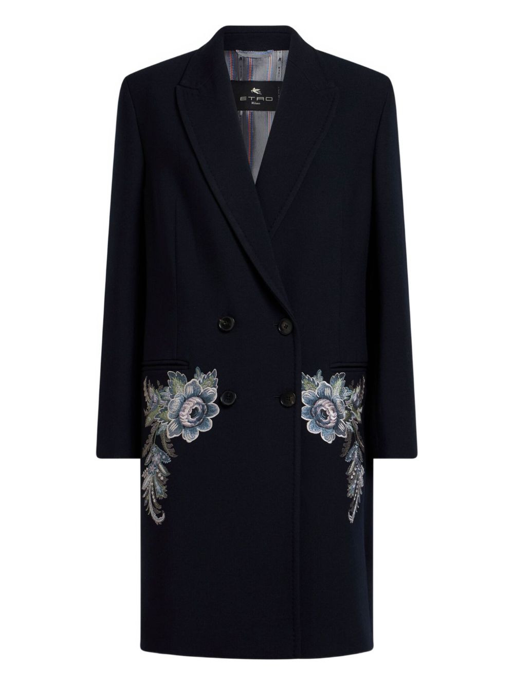 embroidered double-breasted boat Highlights - Navy blue - Button front fastening - Floral embroidery - Notched lapels - Side slit pockets - Long sleeves Made in Italy Composition Outer: Polyester 52%, Wool 44%, Elastane 4% Lining: Viscose 52%, Acetate 48% Polyester 100% Washing instructions Read Manufacturer Guidelines