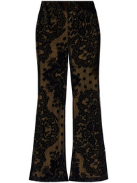 embroidered floral flare trousers Highlights - Black/nude - Semi-sheer construction - All-over floral embroidery - High-waisted - Slight flare - Elasticated waistband Made in Italy Composition Viscose 93%, Polyamide 4%, Elastane 3% SIZE & FIT Measurement FRONT RISE 10.51 in(26.7 cm) INSIDE LEG 32.99 in(83.8 cm) BACK RISE 11.49 in(29.2 cm) HIPS 27.99 in(71.1 cm) Hem Width 20 in(50.8 cm) WAIST 25 in(63.5 cm)