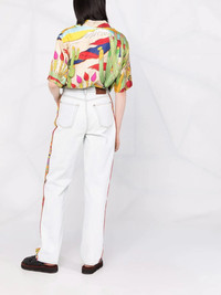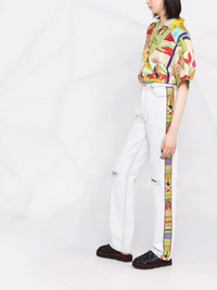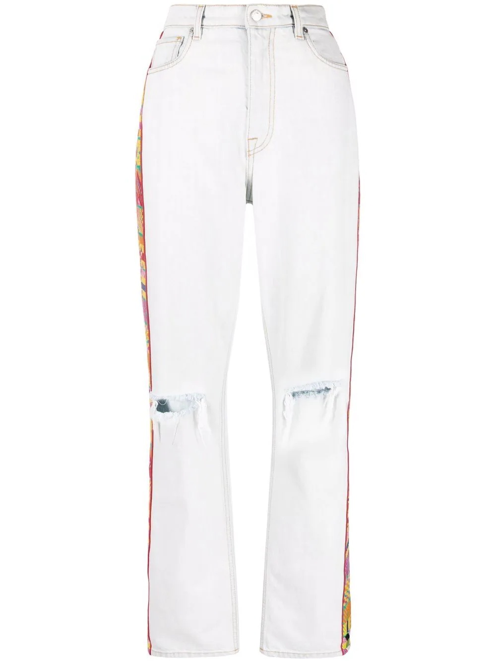 embroidered-trim straight-leg jeans The use of intricate patterns is key to ETRO's distinctive design style. Crafted from a white cotton blend, these straight-leg jeans are defined by ripped knees and a geometric-embroidered trim. Made in Italy Composition Cotton 50%, Viscose 50% SIZE & FIT Model measurements Height 5 ft 10 in(1.79 m) Bust/Chest 30.31 in(77 cm) Hips 33.85 in(86 cm) Waist 25.59 in(65 cm) FittingInformation This piece fits true to size. We recommend you get your regular size Designed to be fitted at the waist and hips, loose over the leg Made with a mid-weight non-stretch fabric Washing instructions Machine Wash