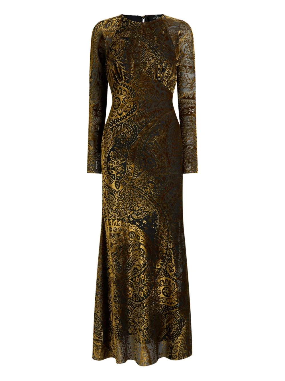 LONG BURNOUT VELVET DRESS WITH FLORAL PAISLEY MOTIF