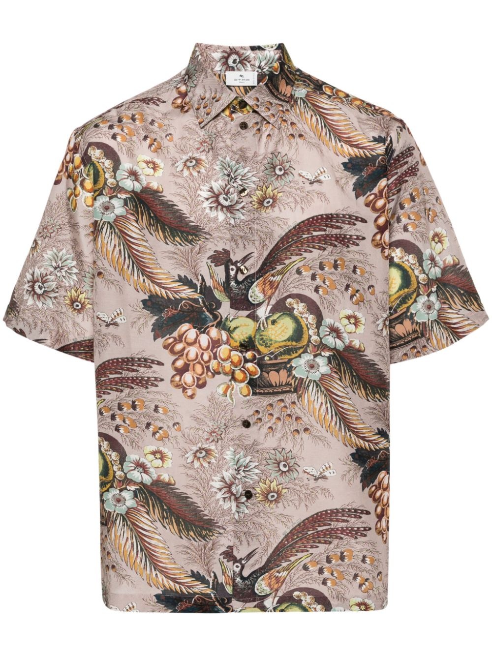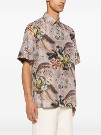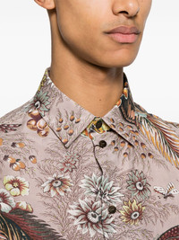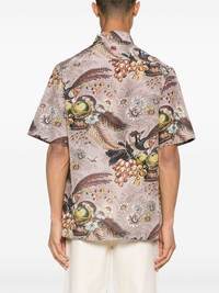 floral-print bowling shirt Highlights - Light pink/multicolour - Cotton-silk blend - Poplin texture - Diagonal stripe pattern - All-over floral and graphic print - Camp collar - Front button fastening - Short sleeves - Short side slits - Straight hem Made in Italy Composition Cotton 65%, Silk 35% SIZE & FIT Model measurements Height 6 ft 2 in(1.87 m) Bust/Chest 38.18 in(97 cm) Hips 36.61 in(93 cm) Waist 29.13 in(74 cm) FittingInformation Designed to be unstructured, offering a loose fit throughout Made from a lightweight non-stretch fabric This piece fits true to size – take your usual size Washing instructions Machine Wash