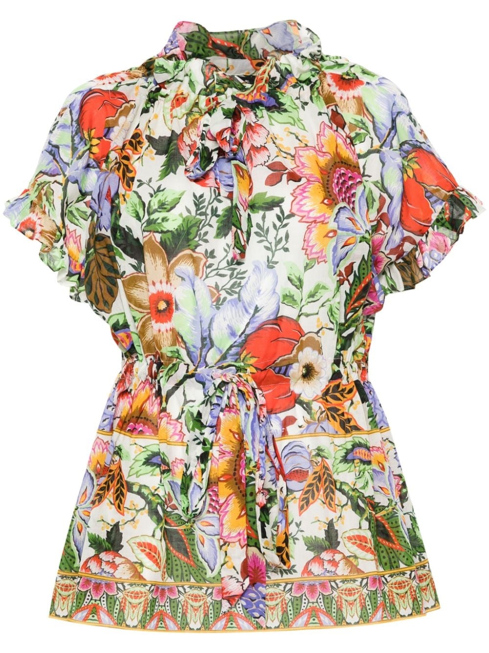 floral-print cotton blouse Highlights - Multicolour - Cotton - All-over floral print - Ruffle collar - Short sleeves - Tied waist - Straight hem Made in Italy Composition Cotton 100% SIZE & FIT Model measurements Height 5 ft 10 in(1.77 m) Bust/Chest 31.88 in(81 cm) Hips 36.22 in(92 cm) Waist 24.01 in(61 cm) Measurement SLEEVE LENGTH 10.23 in(26 cm) LENGTH 27.55 in(70 cm) WAIST 66.92 in(170 cm) FittingInformation Designed to be unstructured, offering a loose fit throughout The adjustable drawstring means that you can adjust this piece’s fit to suit your comfort and preference Made from a lightweight non-stretch fabric This piece fits true to size – take your usual size Washing instructions Dry Clean Only