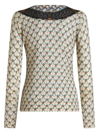 floral-print knitted top Decorated with a Floralia floral print with ornamental edging, this knitted top perfectly showcases ETRO's bohemian approach to design. It's crafted from a smooth silk-cashmere blend and boasts a slim fit. Highlights - Ecru/multicolour - Cashmere-silk blend - Knitted construction - All-over floral print - Crew neck - Long sleeves - Straight hem Made in Italy Composition Silk 55%, Cashmere 45% SIZE & FIT FittingInformation Designed for a slim fit that sits just away from the body offering a close yet comfortable fit Made with a midweight knit, this piece offers some stretch This piece fits true to size – take your usual size
