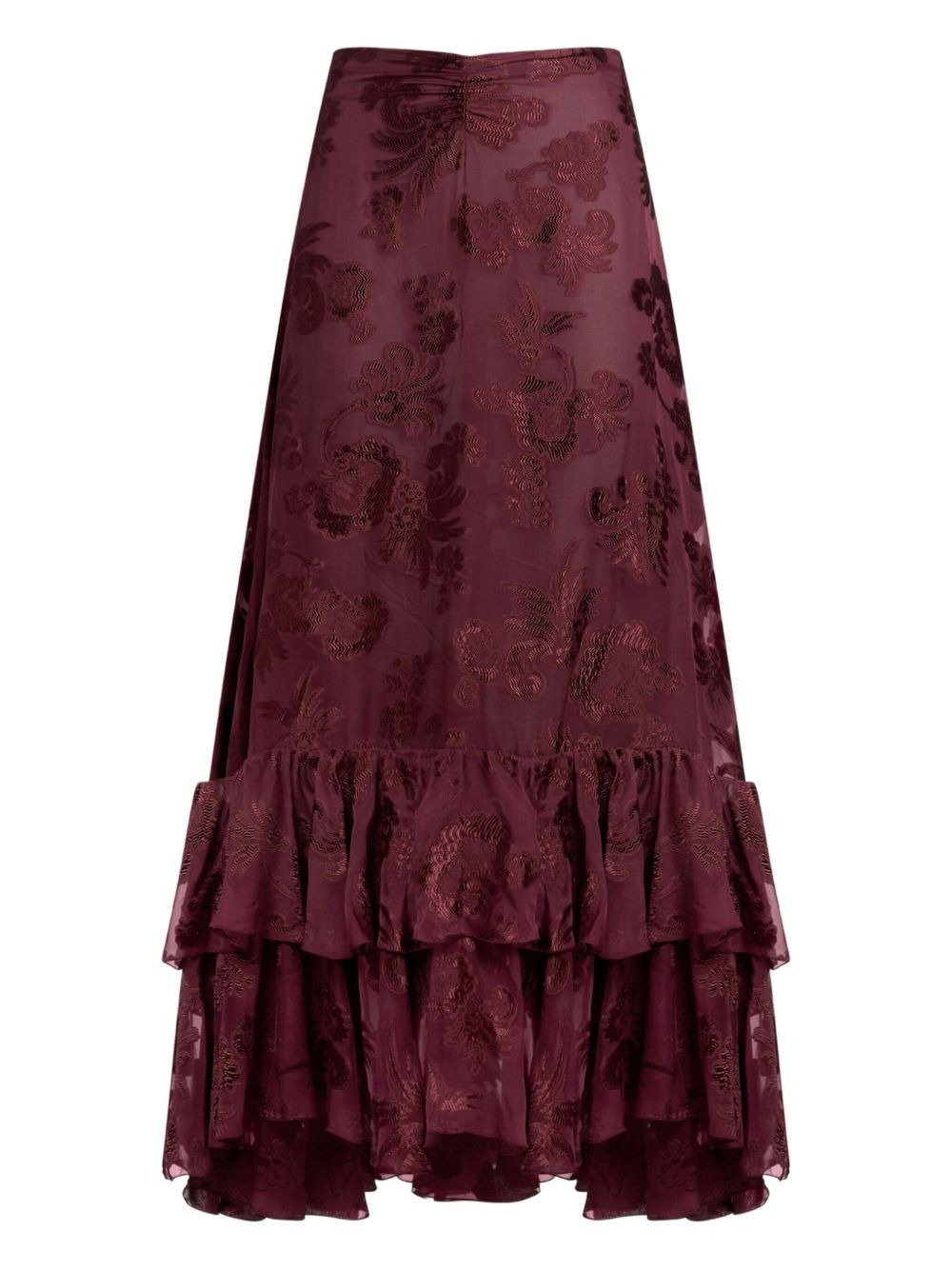 floral-print ruffled maxi skirt Highlights - Burgundy - Floral pattern - Tiered ruffles - A-line shape Made in Italy Composition Outer: Viscose 56%, Silk 44% Lining: Polyester 100% Washing instructions Read Manufacturer Guidelines