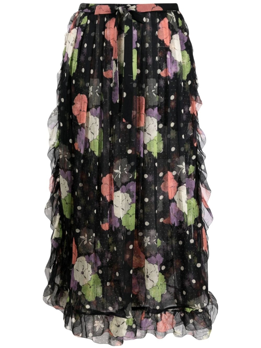 floral-print ruffled midi skirt Highlights - Black/multicolour - Silk - All-over floral print - Bold polka dot print - Ruffled trim - Fully pleated - High-waisted - Tied waist - Side slits - Mid-length Made in Italy Composition Lining: Silk 100% Outer: Silk 100% SIZE & FIT Model measurements Height 5 ft 11 in(1.8 m) Bust/Chest 31.49 in(80 cm) Hips 36.22 in(92 cm) Waist 25.59 in(65 cm) FittingInformation This midi-length skirt is intended to be worn just below the waist Made from a lightweight non-stretch fabric This piece fits true to size – take your usual size Washing instructions Dry Clean Only