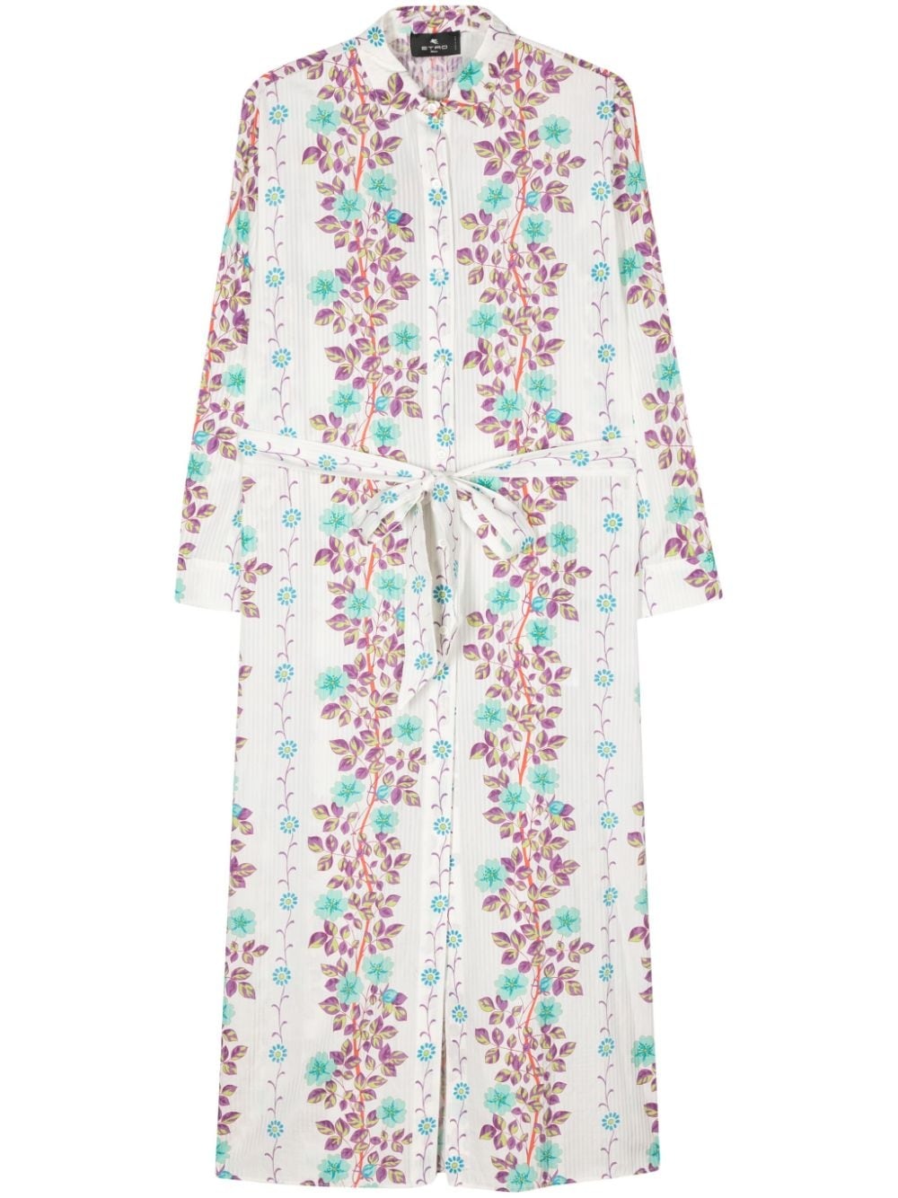 floral-print shirtdress ETRO is known for its vibrant colours and head-turning patterns and this shirtdress is a prime example. It's cut in Italy from a white cotton-silk blend and adorned with an all-over floral vine print in pink and turquoise hues. Highlights - White/multicolour - Cotton-silk blend - All-over floral print - Spread collar - Front button placket - Long sleeves - Tied waist - Straight hem Made in Italy Composition Cotton 82%, Silk 18% Washing instructions Machine Wash