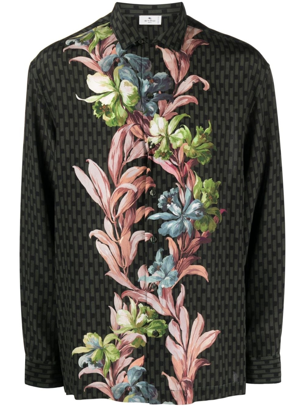 floral-print silk shirt Highlights - Olive green/multicolour - Silk - Geometric print - Floral print to the front - Spread collar - Front button fastening - Long sleeves - Buttoned cuffs - Straight hem Made in Italy Composition Silk 100% SIZE & FIT Model measurements Height 6 ft 2 in(1.87 m) Bust/Chest 36.41 in(92.5 cm) Hips 37 in(94 cm) Waist 29.52 in(75 cm) FittingInformation Designed to be unstructured, offering a loose fit throughout Made from a lightweight non-stretch fabric This piece fits true to size – take your usual size Washing instructions Dry Clean Only
