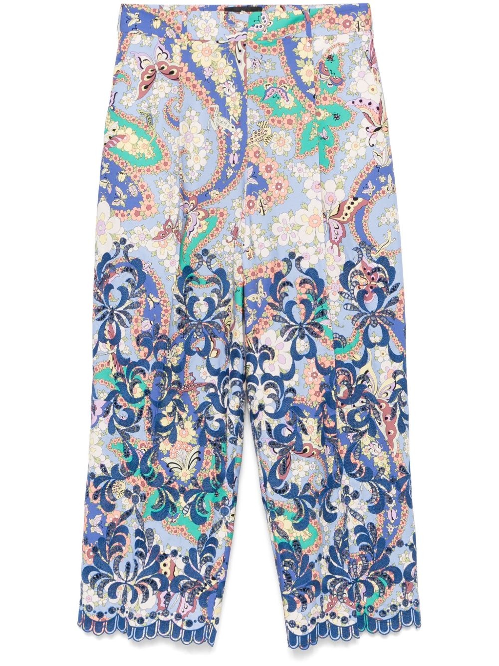 floral-print trousers Highlights - Cornflower blue - Front button and zip fastening - Two side slash pockets - Two rear patch pockets - Pleat detailing Made in Italy Composition Cotton 100%