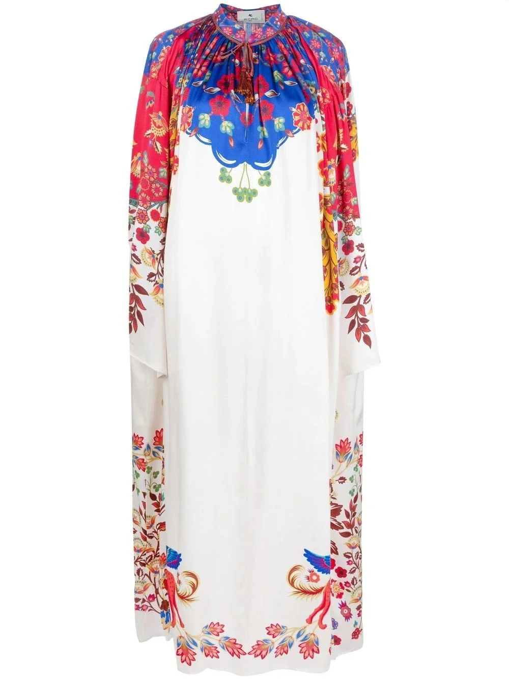 floral-print tunic dress floral-print tunic dress from ETRO featuring multicolour, silk, floral print, mandarin, gathered tie neck, drop shoulder, long sleeves, tonal stitching and long length. Made in Italy Composition Silk 100% SIZE & FIT Model measurements Height 5 ft 10 in(1.78 m) Bust/Chest 30.31 in(77 cm) Hips 36.61 in(93 cm) Waist 24.8 in(63 cm) Measurement HIPS 48.03 in(122 cm) LENGTH 56.69 in(144 cm) WAIST 48.03 in(122 cm) FittingInformation This piece fits true to size. We recommend you get your regular size Cut for a loose fit Made with a mid-weight non-stretch fabric Washing instructions Dry Clean Only