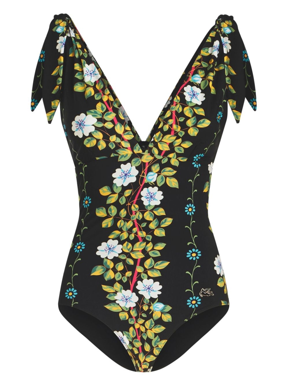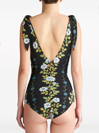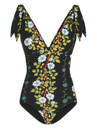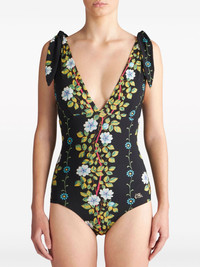 floral-print V-neck swimsuit Highlights - Black/multicolour - Stretch-design - All-over floral print - Knot detailing - Plunging v-neck - Sleeveless - V-back - Be mindful to try on swimwear over your own garments. Made in Italy Composition Outer: Polyamide 72%, Elastane 28% Lining: Polyamide 75%, Elastane 25% Washing instructions Read Manufacturer Guidelines
