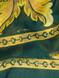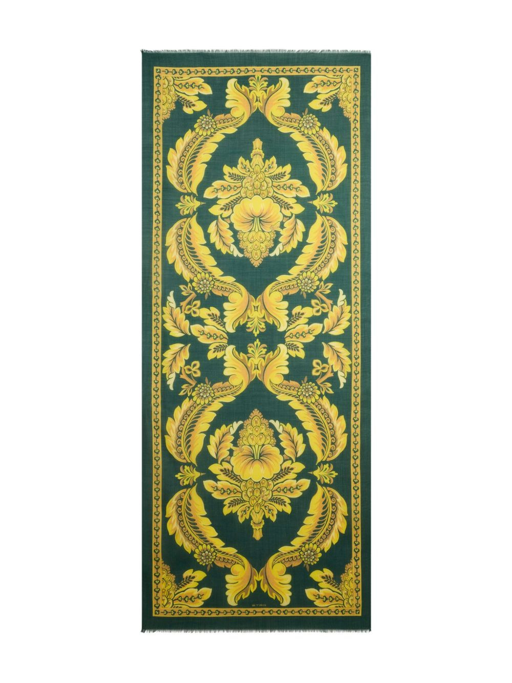 flower-bee motif scarf Highlights - Dark green - Floral pattern - Bee motif - Gold-yellow accents - Fringed edges Made in Italy Composition Wool 40%, Cashmere 30%, Silk 30%