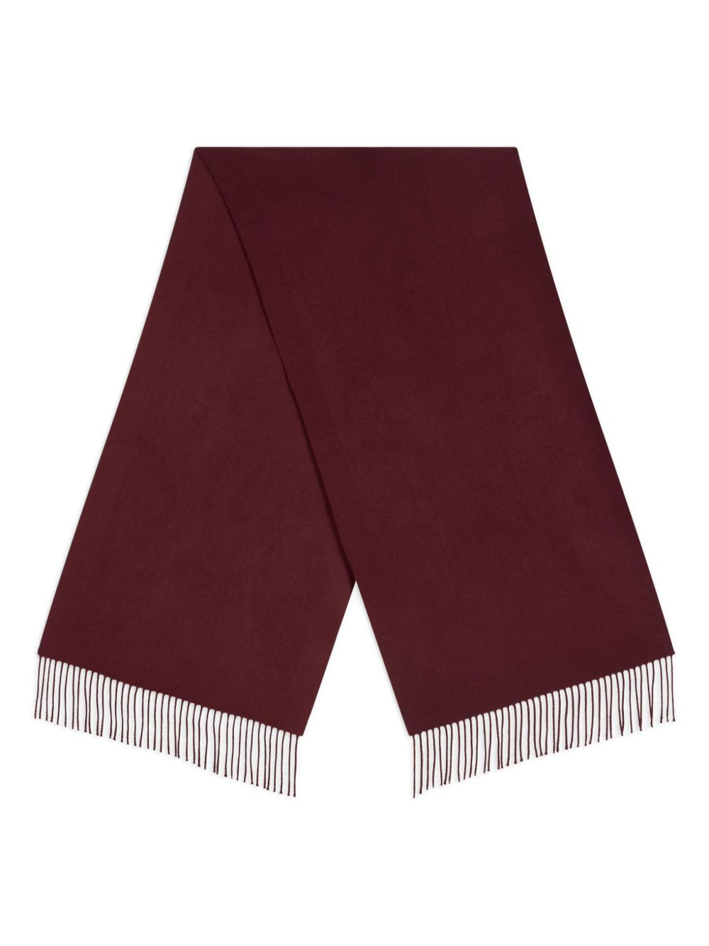 fringed-edge scarf Highlights - Burgundy - Fringed edges - Rectangular shape Made in Italy Composition Wool 100% SIZE & FIT Measurement LENGTH 70.86 in(180 cm) WIDTH 20.47 in(52 cm) Washing instructions Read Manufacturer Guidelines