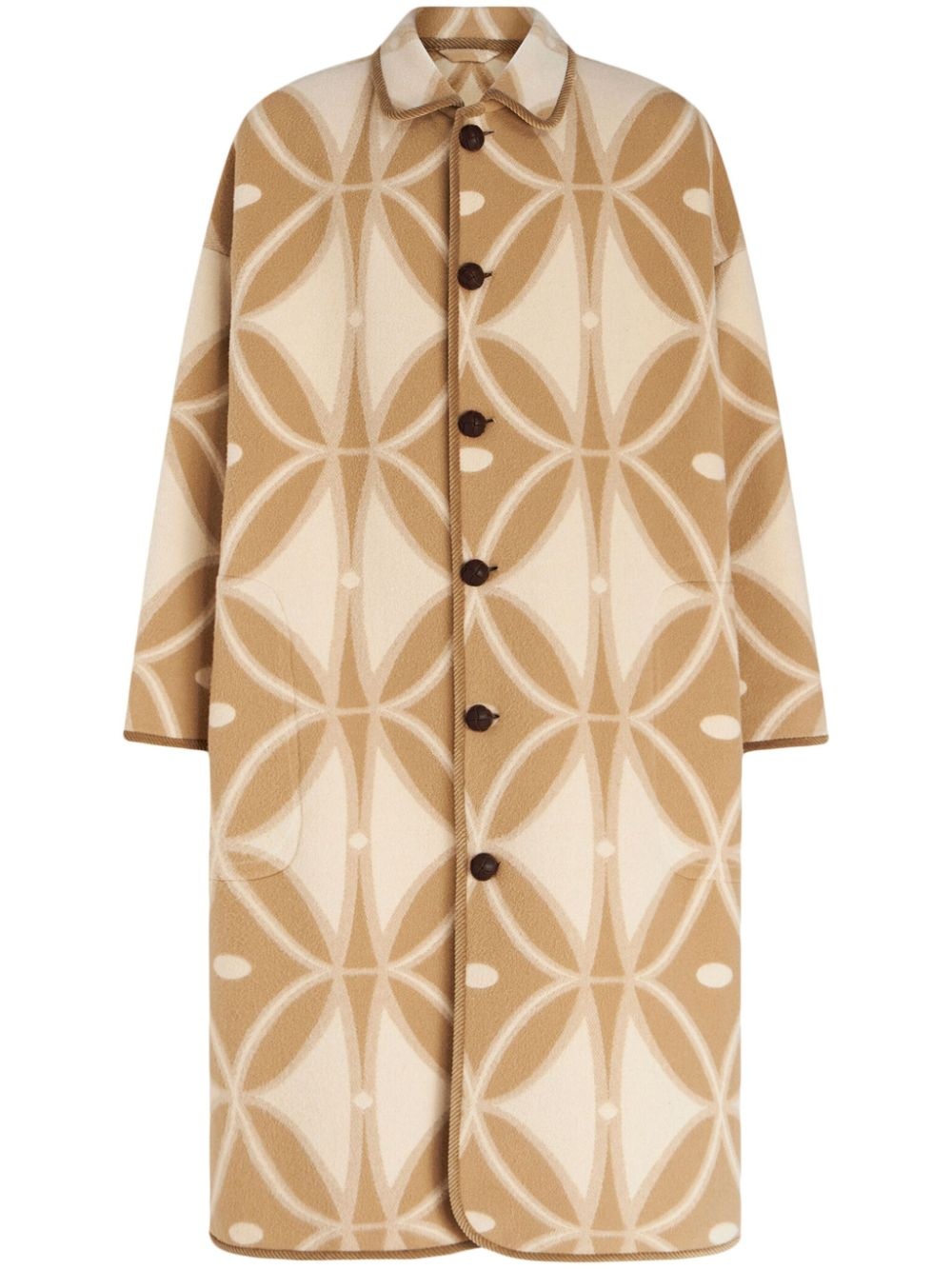 geometric-pattern wool jacquard coat Showing the brand's love for bold prints and details, this single-breasted coat from ETRO's AW23 collection is decorated with a geometric pattern in contrasting hues. Crafted from wool, the piece is also detailed with woven leather buttons at the front. Highlights - Beige - Wool - Patterned jacquard - Classic collar - Front button fastening - Long sleeves - Straight hem Made in Italy Composition Wool 100%, Cotton 100%