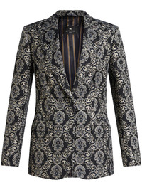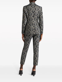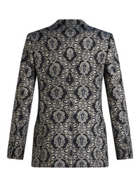 graphic-jacquard blazer Spotlighting a patterned jacquard that resembles antique tapestries, this ETRO blazer is crafted from a cotton blend to a single-breatsted silhouette. The silver tone of the motif contrasts with the navy blue background. Highlights - Black - Cotton blend - Patterned jacquard - Peak lapels - Front button fastening - Long sleeves - Two front flap pockets - Straight hem Made in Italy Composition Outer: Polyester 49%, Cotton 46%, Metallic Fibre 4%, Polyamide 1% Lining: Viscose 52%, Acetate 48% SIZE & FIT Measurement LENGTH 27.55 in(70 cm) WAIST 34.64 in(88 cm) BUST 33.85 in(86 cm) SLEEVE LENGTH 15.35 in(39 cm) Washing instructions Read Manufacturer Guidelines