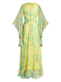 graphic-print silk dress Highlights - Light green/light yellow - Silk - All-over graphic print - V-neck - Three-quarter length sleeves - Ruffle cuffs - Flared skirt - Floor-length - Ruffle hem Made in Italy Composition Outer: Silk 100% Lining: Polyester 100% SIZE & FIT FittingInformation Designed for a close fit at the chest and waist with a loose fit at the hip Made from a midweight non-stretch fabric This piece fits true to size – take your usual size