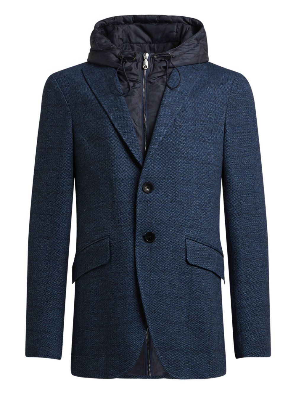 herringbone removable-hood jacket Highlights - Dark-blue - Herringbone pattern - Two-button fastening - Removable hooded bib - Zip fastening bib - Long sleeves Made in Italy Composition Zamak 100%, Polyester 50%, Viscose 48%, Elastane 2%