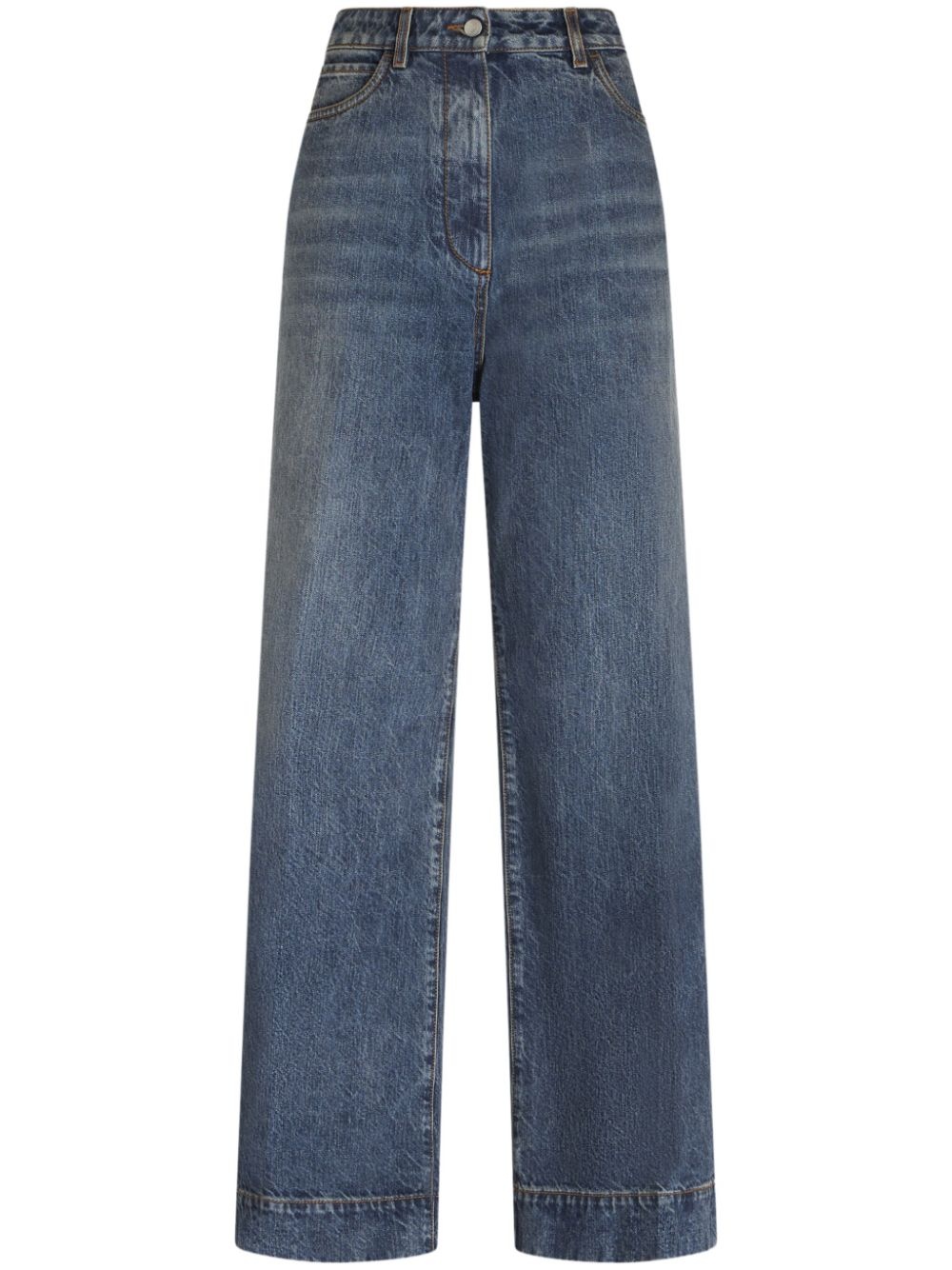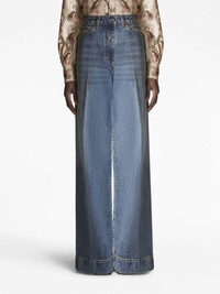 high-rise flared jeans Highlights - Blue - Cotton - Denim - Whiskering effect - Flared design - Signature pegaso motif - Embroidered logo to the rear - High waist - Button fly fastening - Classic five pockets - Floor-length Made in Italy Composition Cotton 100% SIZE & FIT Measurement FRONT RISE 14.17 in(36 cm) INSIDE LEG 33.07 in(84 cm) HIPS 41.73 in(106 cm)