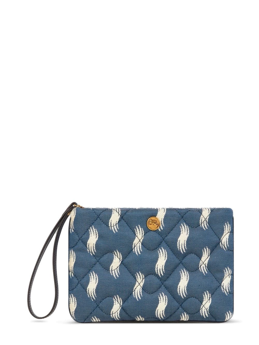 jacquard quilted pouch Highlights - Navy blue - Cotton - Patterned jacquard - Gold-tone logo plaque - Wrist strap - Top zip fastening - Main compartment - Full lining Made in Italy Composition Lining: Polyester 100% Outer: Cotton 100%, Leather 100% SIZE & FIT Measurement HEIGHT 7.08 in(18 cm) WIDTH 9.64 in(24.5 cm)