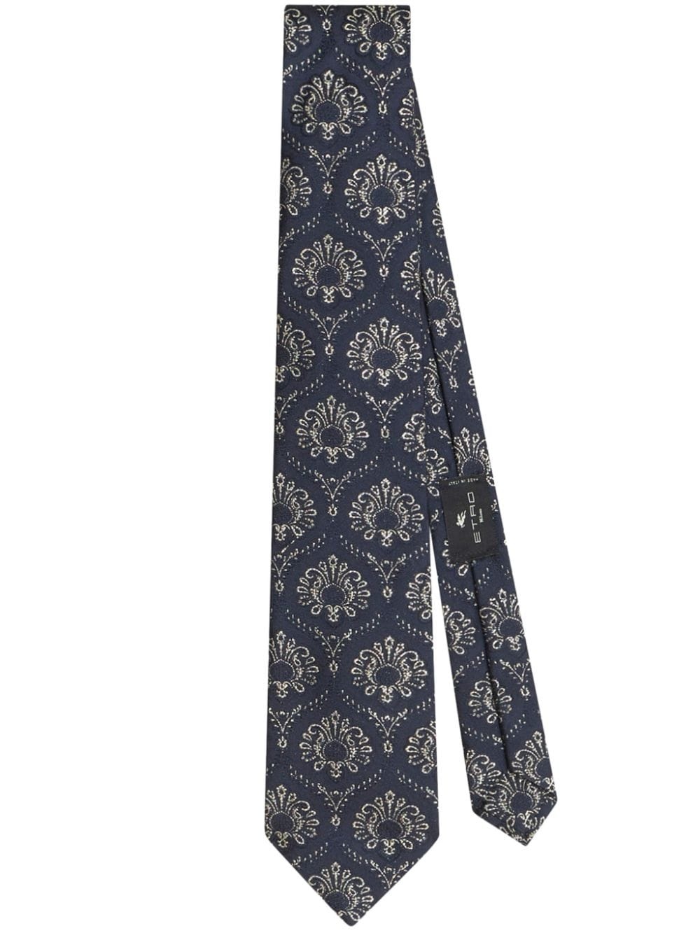 jacquard silk-blend tie Highlights - Navy blue - Silk - Metallic threading - Full jacquard - Pointed tip - Adjustable fit Made in Italy Composition Silk 90%, Metallic Fibre 7%, Polyamide 3%