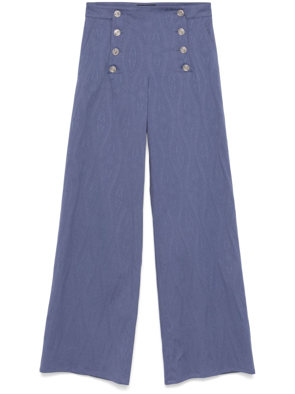 jacquard trousers Highlights - Cerulean blue - Front button fastening - Front hook and eye fastening - Two side slash pockets - Two rear patch pockets Imported Composition Cotton 98%, Elastane 2% SIZE & FIT Model measurements Height 5 ft 10 in(1.78 m) Bust/Chest 33.46 in(85 cm) Hips 36.22 in(92 cm) Waist 23.22 in(59 cm) FittingInformation Designed with a wide-leg cut, these trousers allow for a close fit at the waist and offer a loose and roomy fit over the leg Made from a midweight stretch fabric, this piece offers elasticity and flexibility when worn