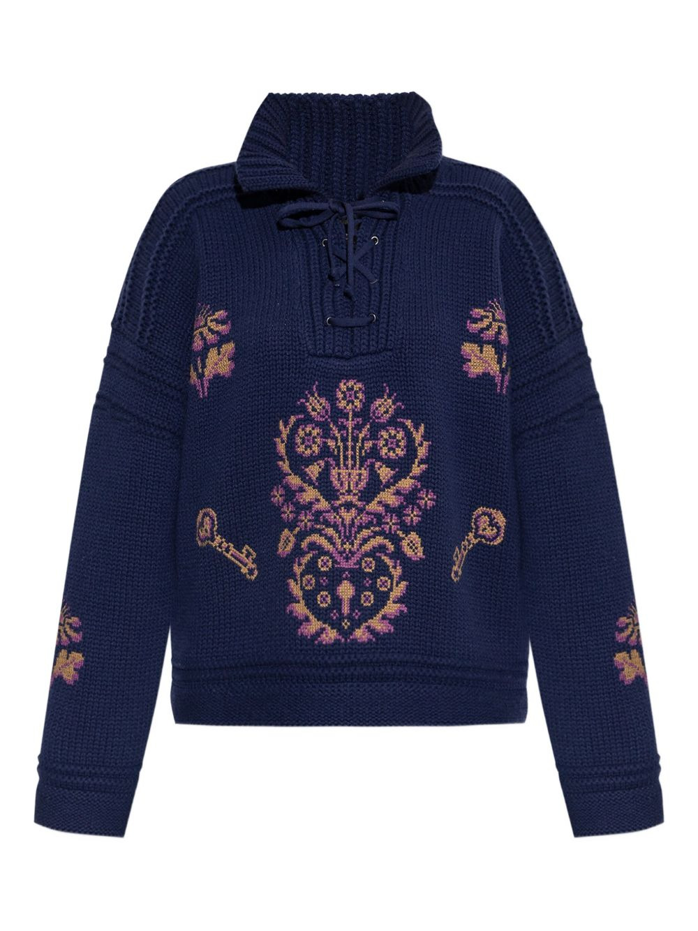 lace-up embroidered sweater Highlights - Blue - Lace-up neckline - Embroidered floral pattern - Ribbed trims - Wool material Made in Italy Composition Virgin Wool 100% Washing instructions Read Manufacturer Guidelines