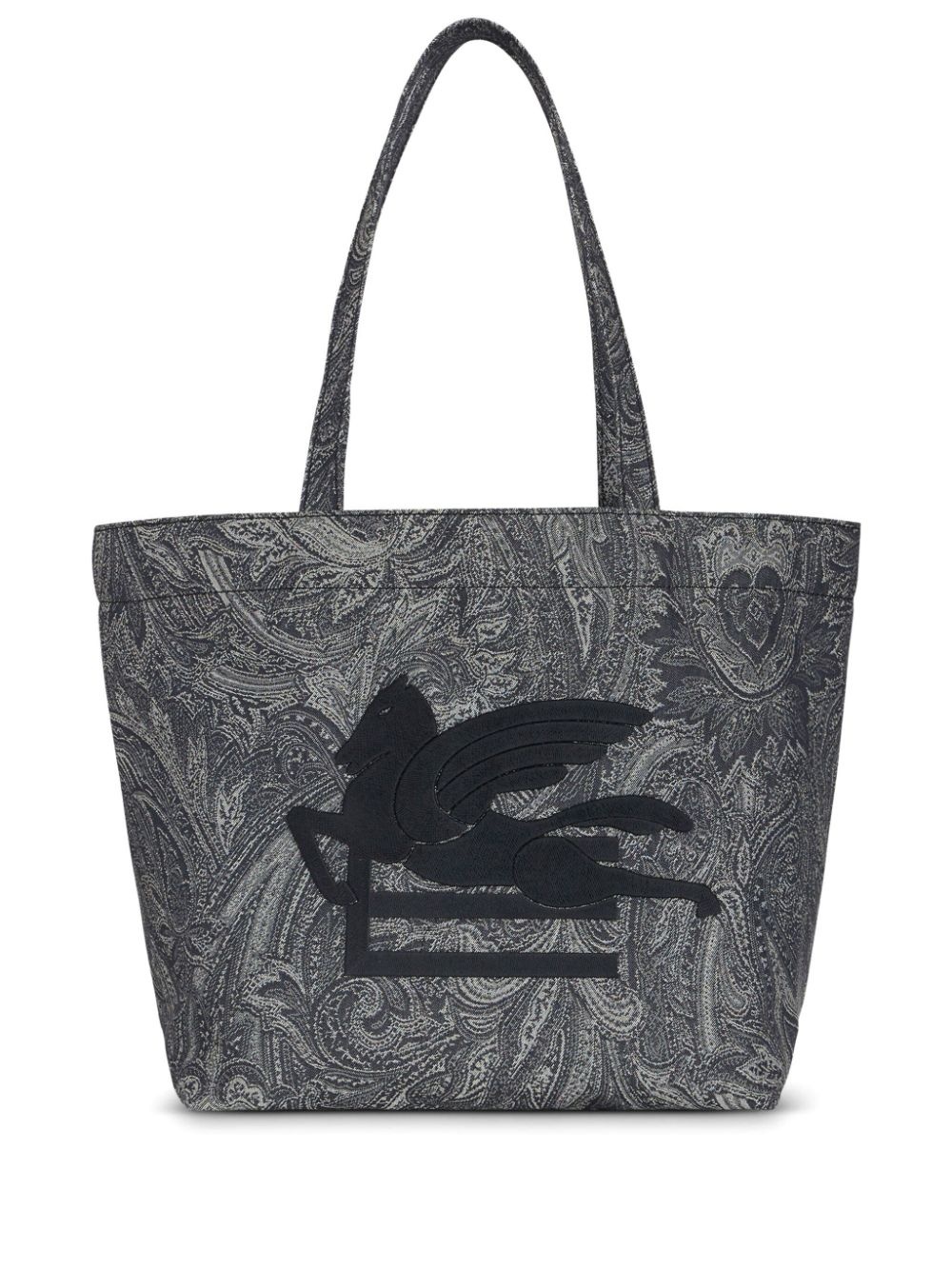 large Pegaso-motif paisley-jacquard tote bag Highlights - Black/grey - Cotton blend - Leather trim - Paisley jacquard - Signature pegaso jacquard - Two flat top handles - Open top - Main compartment - Internal logo patch - Internal zip-fastening pocket - Striped lining Made In Italy Composition Outer: Calf Leather 100%, Cotton 54%, Polyester 46% SIZE & FIT Measurement DEPTH 7.87 in(20 cm) HANDLE 11.81 in(30 cm) HEIGHT 14.17 in(36 cm) WIDTH 17.71 in(45 cm)