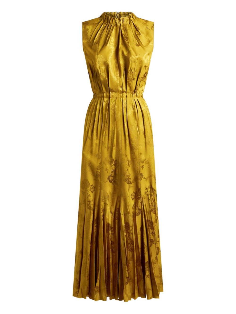 leaf-jacquard pleated dress Highlights - Yellow gold - Sleeveless design - Pleated skirt - Gathered neckline - Floral-jacquard motif - High neck Made in Italy Composition Viscose 84%, Wool 16% Washing instructions Read Manufacturer Guidelines