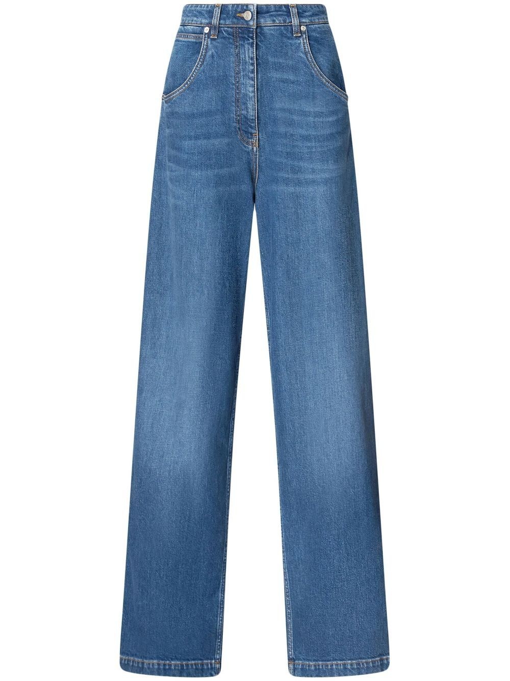 logo-applique wide-leg jeans Cut to an unconventional tapered wide-leg style that sits over the shoe, these Etro jeans will mix up any denim collection. Complete with an applique logo to the rear, a mid-rise waist and multiple pockets for added practicality. Made in Italy Composition Cotton 98%, Elastane 2%