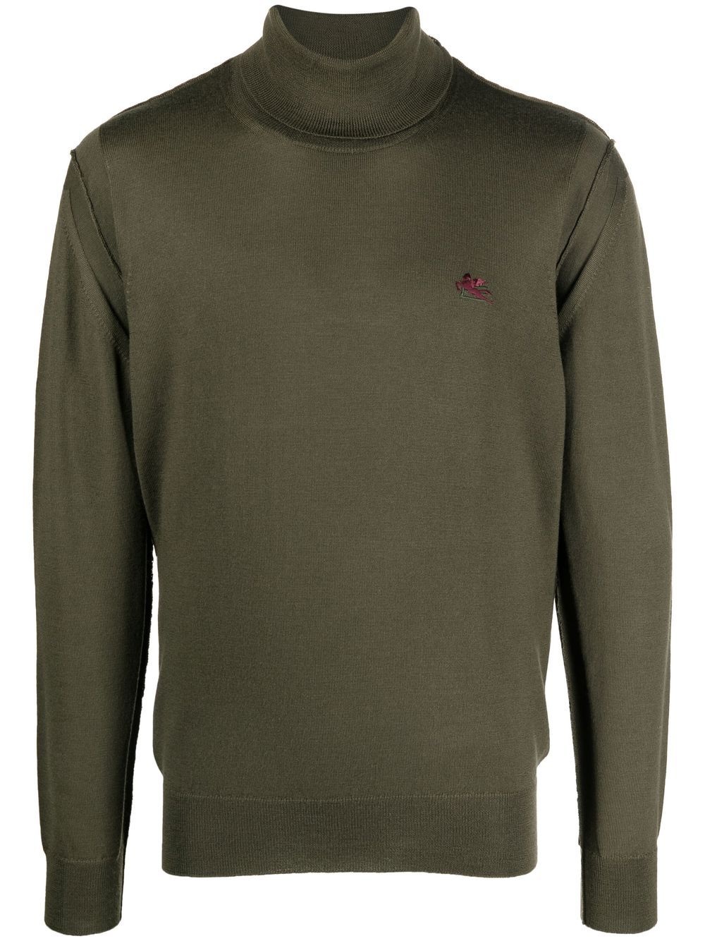 logo-embroidered roll-neck jumper logo-embroidered roll-neck jumper from ETRO featuring military green, purple, virgin wool, knitted construction, signature Pegaso motif, embroidered logo at the chest, roll neck, ribbed edge, seam detailing, long sleeves and straight hem. Made in Italy Composition Virgin Wool 100% SIZE & FIT Model measurements Height 6 ft 2 in(1.87 m) Bust/Chest 36.41 in(92.5 cm) Hips 37 in(94 cm) Waist 29.52 in(75 cm) FittingInformation Designed for a regular fit, offering a comfortable loose fit throughout the body Made with a lightweight knit, this piece offers some stretch This piece fits true to size – take your usual size Washing instructions Hand Wash