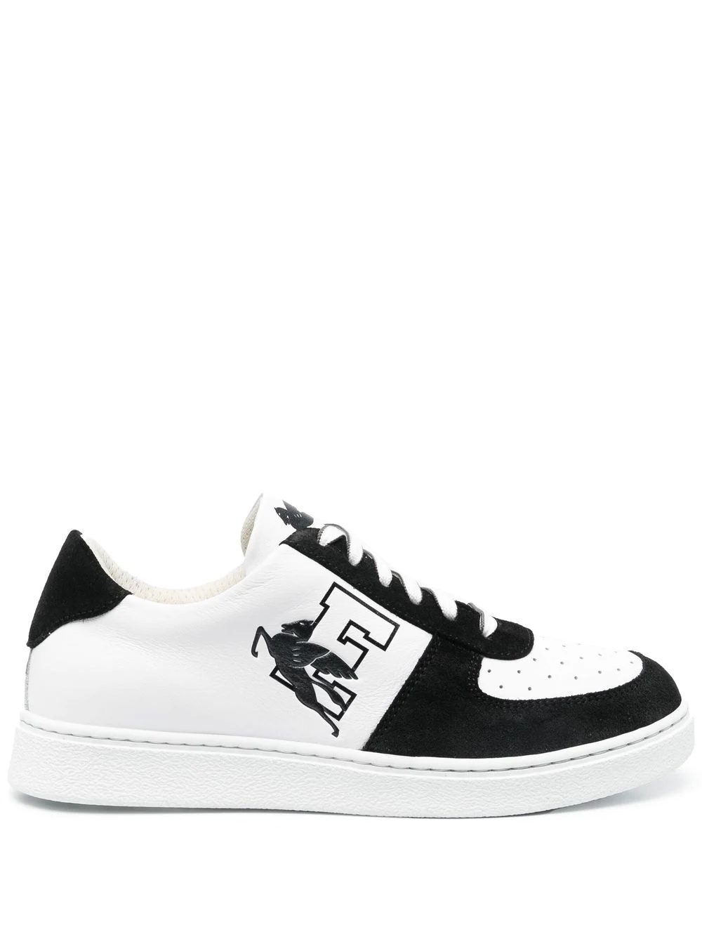 logo-print lace-up sneakers logo-print lace-up sneakers from ETRO featuring black/white, perforated detailing, logo-print tongue, logo print to the side, round toe, front lace-up fastening, branded insole, flat rubber sole and calf leather blend. Made in Italy Composition Leather 100% SIZE & FIT Measurement HEEL 0.98 in(2.5 cm) Sole height 0.78 in(2 cm)