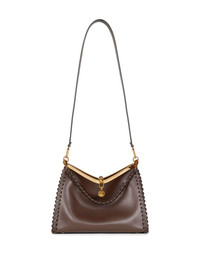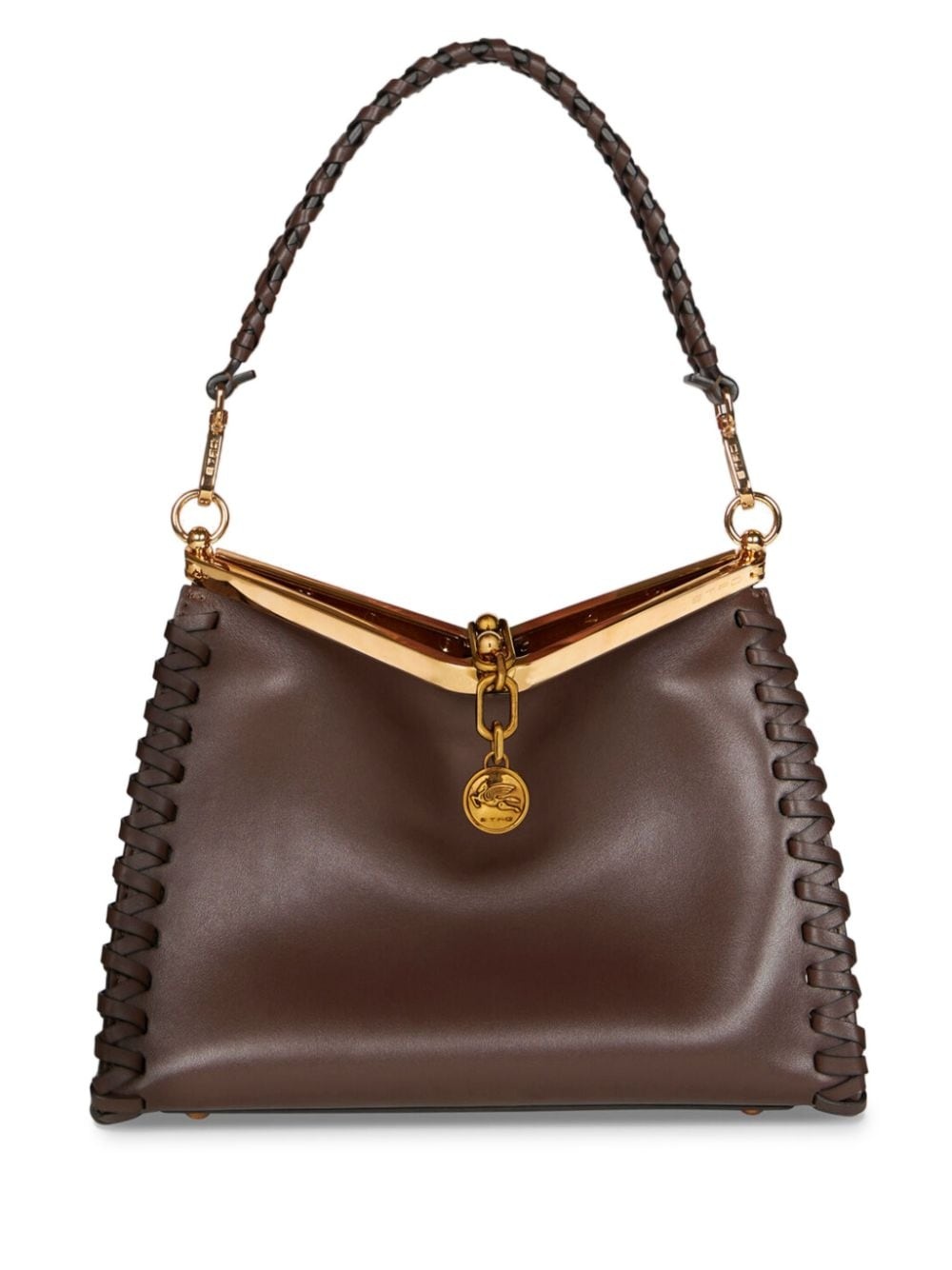 medium Vela leather shoulder bag Highlights - Chocolate brown - Calf leather - Decorative stitching - Signature pegaso motif - Chain-link detailing - Gold-tone hardware - Clasp fastening - Detachable shoulder strap - Single detachable top handle - Main compartment - Removable pouch - Metal feet Made in Italy Composition Outer: Calf Leather 100%