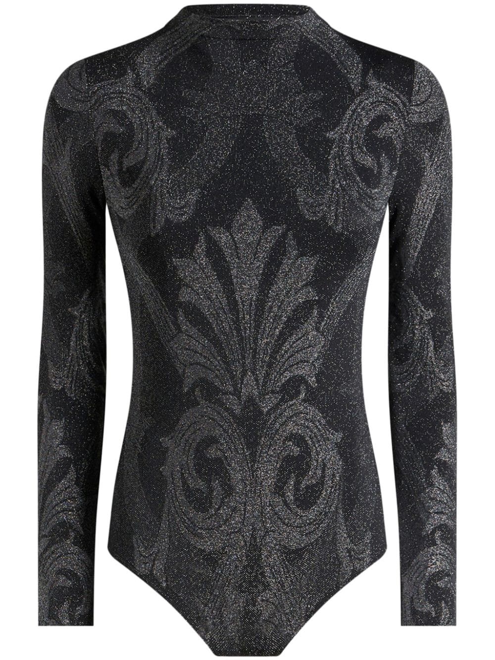 metallic-effect jacquard bodysuit Highlights - Black/dark grey - Lurex detailing - Patterned jacquard - Metallic effect - Concealed press-stud fastening - Round neck - Long sleeves - High cut - Just a reminder that this piece must be tried on over your own garments. Made in Italy Composition Outer: Polyamide 92%, Elastane 5%, Polyester 3%
