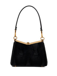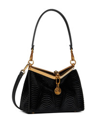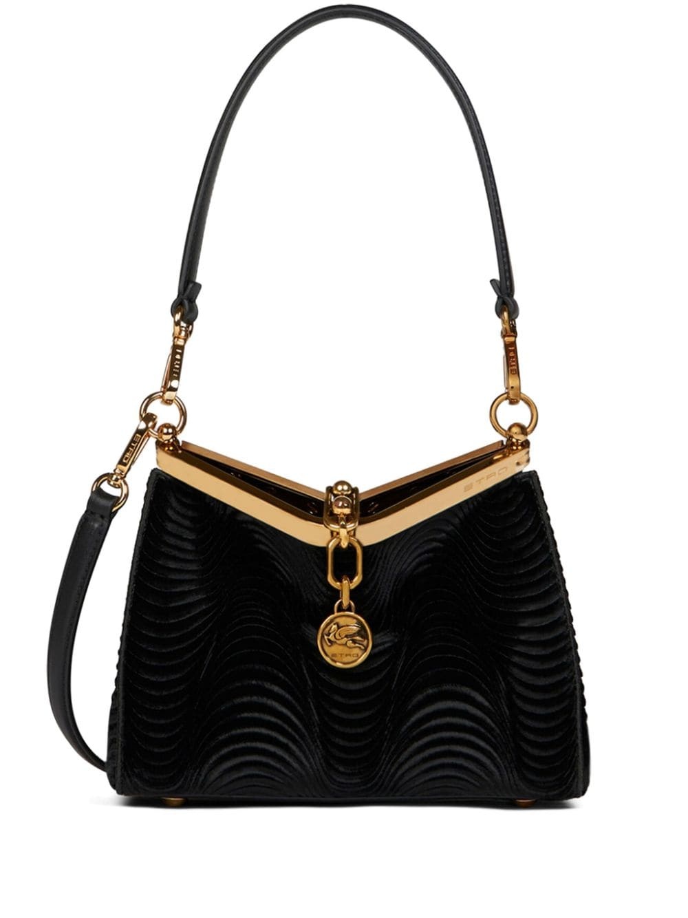 mini Vela tote bag Highlights - Black - Velvet - Top clasp fastening - Single detachable top handle - Adjustable detachable shoulder strap - Logo charm - Signature pegaso motif - Pleat detailing - Logo-engraved arm - Main compartment Made in Italy Composition Outer: Viscose 100% Lining: CALFSKIN 100% Trims: CALFSKIN 100%, Polyester 100% SIZE & FIT Measurement DEPTH 3.54 in(9 cm) HEIGHT 6.29 in(16 cm) WIDTH 8.26 in(21 cm)