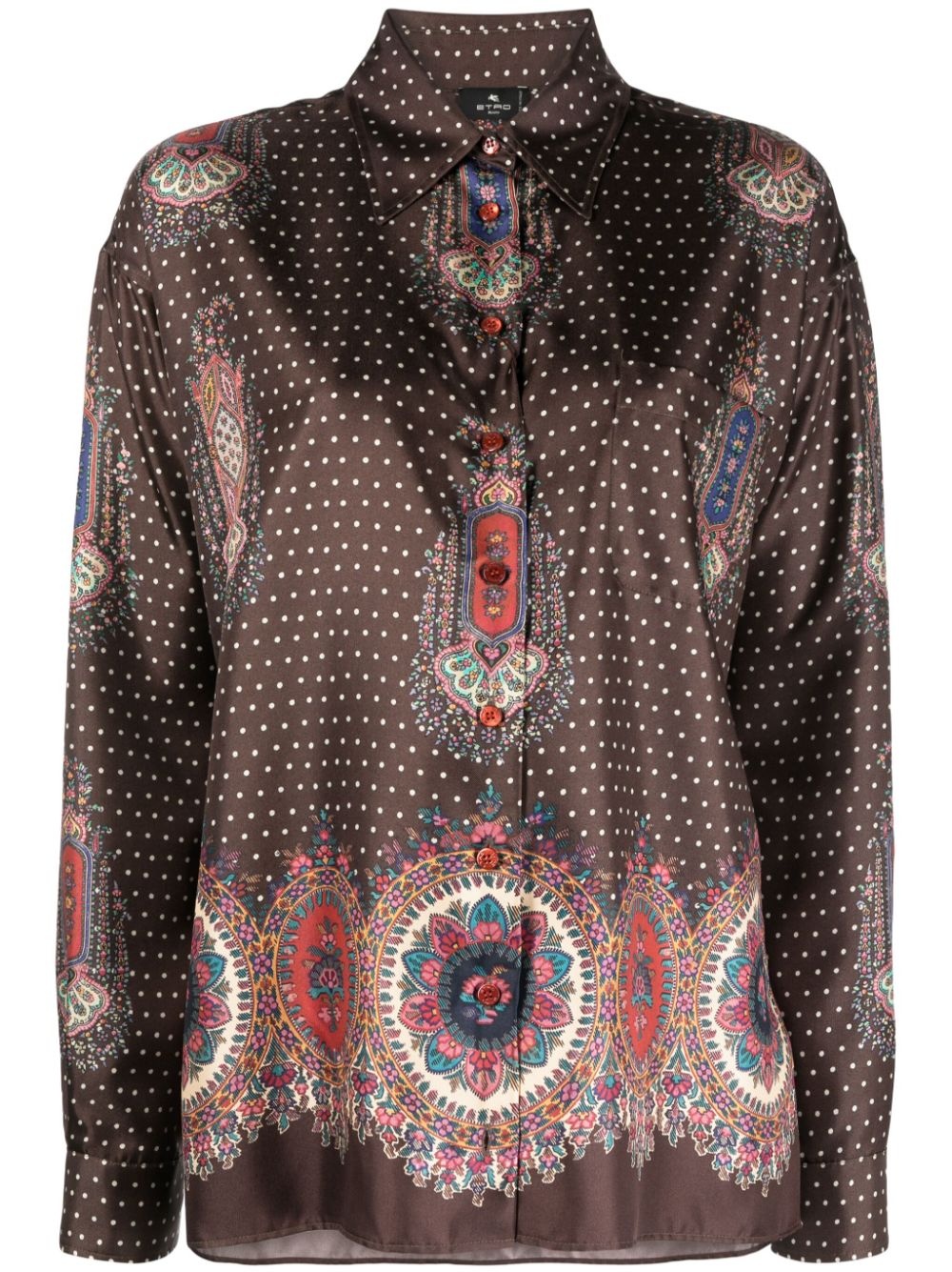 mix-print pointed-collar silk shirt Highlights - Chocolate brown/multicolour - Silk - Satin finish - Mix print - Pointed flat collar - Front button fastening - Long sleeves - Buttoned cuffs - Straight hem Made in Italy Composition Silk 100% SIZE & FIT Model measurements Height 5 ft 10 in(1.78 m) Bust/Chest 31.49 in(80 cm) Hips 36.22 in(92 cm) Waist 25.59 in(65 cm) Measurement LENGTH 27.16 in(69 cm) FittingInformation Designed to be unstructured, offering a loose fit throughout Made from a lightweight non-stretch fabric This piece fits true to size – take your usual size