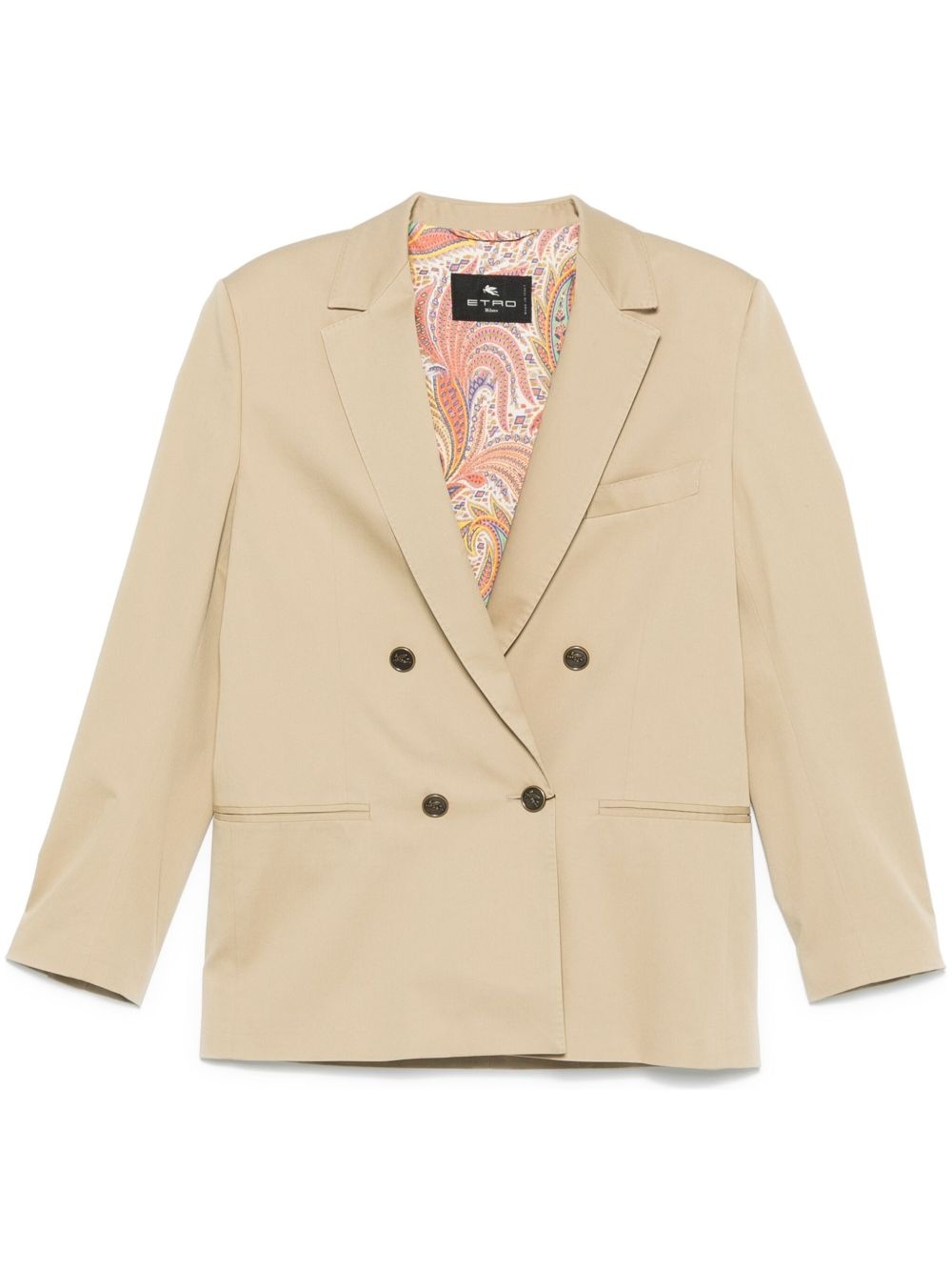 notched-lapels blazer Highlights - Beige - Double-breasted button fastening - Chest welt pocket - Two front jetted pockets - Italian rear vents Made in Italy Composition Outer: Cotton 97%, Spandex/Elastane 3% Lining: Viscose 97%, Spandex/Elastane 3% SIZE & FIT Model measurements Height 5 ft 11 in(1.8 m) Bust/Chest 32.67 in(83 cm) Hips 36.22 in(92 cm) Waist 24.4 in(62 cm) FittingInformation Designed to be unstructured, offering a loose fit throughout The internal shoulder pads offer a structured shape Made from a midweight stretch fabric, this piece offers elasticity and flexibility when worn