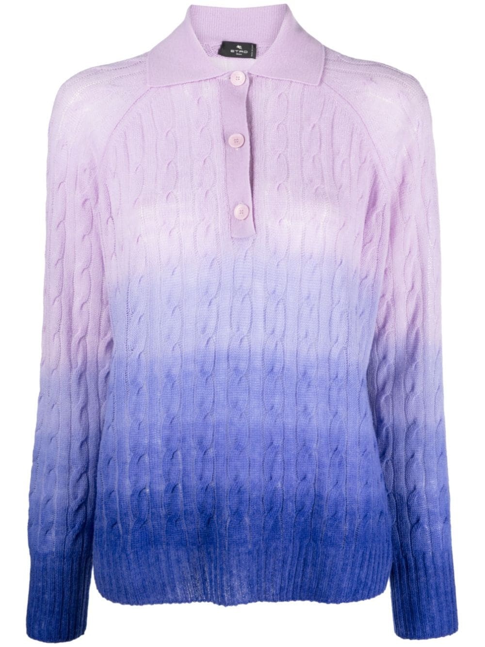 ombre-effect wool jumper This polo jumper shows Etro's focus on bold prints and patterns. Made from wool, it features an eye-catching design with an ombre effect in lilac purple and royal blue. Highlights - Lilac purple - Wool - Cable knit - Ombre effect - Polo collar - Front button placket - Long raglan sleeves - Ribbed cuffs and hem - Straight hem Made in Italy Composition Wool 100% SIZE & FIT Model measurements Height 5 ft 11 in(1.8 m) Bust/Chest 31.49 in(80 cm) Hips 35.82 in(91 cm) Waist 24.8 in(63 cm) FittingInformation Designed for a relaxed fit, this piece allows for comfort and movement when worn Made with a midweight knit, this piece offers some stretch This piece fits true to size – take your usual size