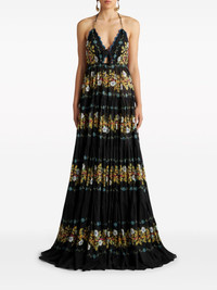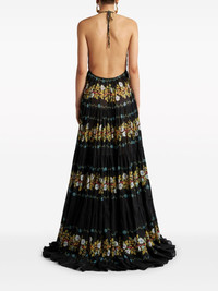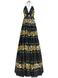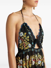 open back floral cotton maxi dress Constructed from lightweight cotton, this ETRO maxi dress is presented in black with a colourful floral print all over. Scallop edges adorn a V-shaped halterneck with a knot and cut-out detail on the stomach. Highlights - Black/multicolour - Cotton - All-over floral print - Scallop edge - Knot detailing - Cut-out detailing - V-neck - Halterneck tie fastening - Sleeveless - Flared skirt - Floor-length Made in Italy Composition Cotton 100%