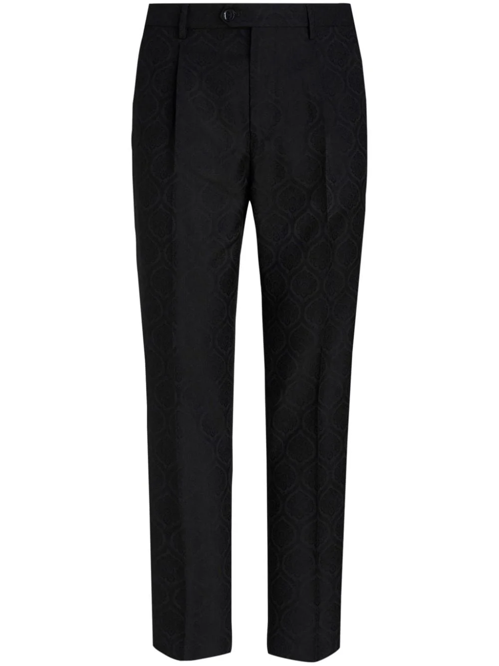 paisley-jacquard straigh-leg trousers Highlights - Black - Cotton-wool blend - Full jacquard - Pressed crease - Paisley print - Belt loops - Off-centre front fastening - Straight leg - Two side slit pockets - Two rear button-fastening jetted pockets - Straight hem Made in Italy Composition Cotton 53%, Wool 47% Washing instructions Read Manufacturer Guidelines