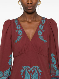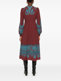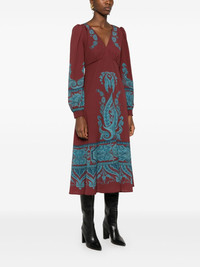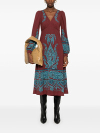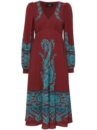 paisley midi dress Highlights - Bordeaux red/blue - Crepe texture - Paisley print - V-neck - Long puff sleeves - Buttoned cuffs - Mid-length - Straight hem - Concealed side zip fastening Made in Italy Composition Lining: Polyester 97%, Elastane 3% Outer: Polyester 97%, Elastane 3% SIZE & FIT Model measurements Height 5 ft 10 in(1.78 m) Bust/Chest 31.49 in(80 cm) Hips 37 in(94 cm) Waist 23.62 in(60 cm) FittingInformation Designed for a close fit at the chest with a loose fit over the waist and hips Made from a midweight non-stretch fabric, this piece offers minimal elasticity when worn This piece fits true to size – take your usual size Washing instructions Dry Clean Only