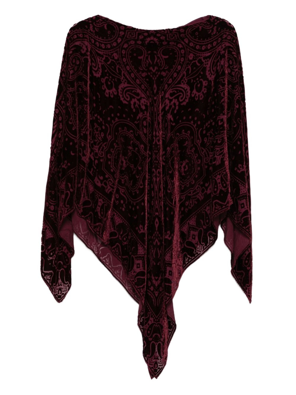 paisley-pattern velvet poncho Highlights - Burgundy red - Velvet texture - Paisley pattern - Boat neckline - Three-quarter sleeves - Asymmetrical hemline Made in Italy Composition Viscose 50%, Silk 50% SIZE & FIT Model measurements Height 5 ft 11 in(1.8 m) Bust/Chest 31.49 in(80 cm) Hips 36.61 in(93 cm) Waist 24.4 in(62 cm) Washing instructions Read Manufacturer Guidelines