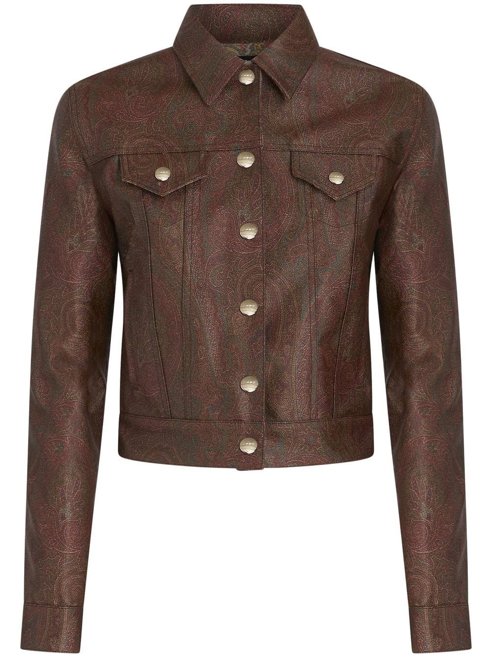 paisley-print cropped jacket dark red paisley print classic collar front button fastening long sleeves buttoned cuffs two chest flap pockets straight hem cotton blend lining Made in Italy Composition Outer: Cotton 76%, Polyester 24% Lining: Viscose 52%, Acetate 48% SIZE & FIT Measurement SLEEVE LENGTH 24.01 in(61 cm) LENGTH 17.99 in(45.7 cm) WAIST 27.99 in(71.1 cm) BUST 32.99 in(83.8 cm)