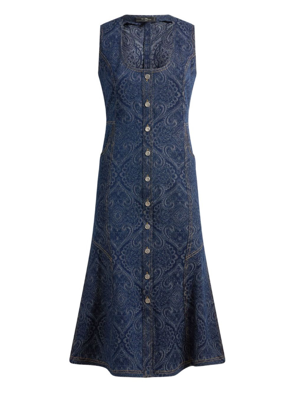 paisley-print denim dress Highlights - Blue - Paisley pattern - Button front - Sleeveless - Square neck - A-line skirt Made in Italy Composition Cotton 98%, Elastane 2% Washing instructions Read Manufacturer Guidelines
